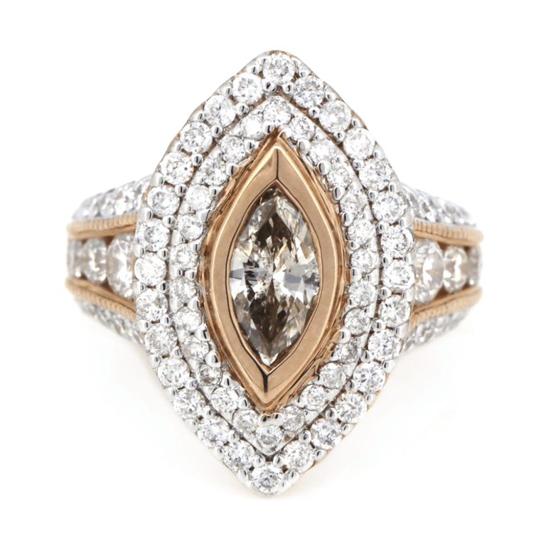The Centre Features, Modified Marquise Cut, Light Fancy Yellow, Diamond (0.76Ct, P2+ Clarity), Bezel Set. Encompassing The Design Are, 86 Round Brilliant Cut, Diamonds (1.74Ct Tdw, H-K Colour, P1+ Clarity), Bead/Pip-Claw Set. Ring Size M 1/2.