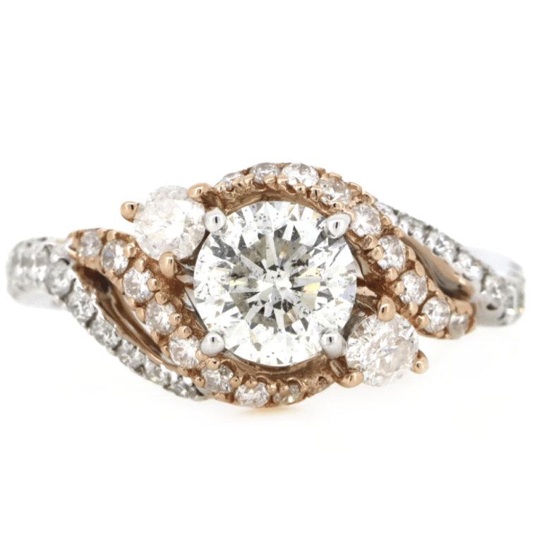 14K WHITE/ROSE GOLD AND DIAMOND, DECORATIVE RING. The Centre Features, One Round Brilliant Cut, Diamond (1.01Ct, I-J Colour, Si2-P1 Clarity), Claw Set. Decorating The Accents Are, 2 Round Brilliant Cut, Diamonds (0.21Ct Tdw, I-J Colour, Si2-P1 Clarity), Claw Set. Decorating The Setting Are, 36 Round Brilliant Cut, Diamonds (0.44Ct Tdw, G-H Colour, Si2-P1 Clarity), Claw Set. Ring Size M. Valuations Provided by an Independent Third-Party Professional Not Directly Associated With Lloyds Auctions at AUD $$30,000.00This valuation has been conducted by an independent third-party professional. The valuation amount is an assessment by the issuing valuer and does not reflect the auction value of the item. Any inquiries regarding the valuation should be directed to the issuing valuer (refer to contact details on the certificate), as Lloyds Auctions has no affiliation or influence over the valuation, the valuer, or the stated amount. Condition: Good - Refer Images 0645832+5222