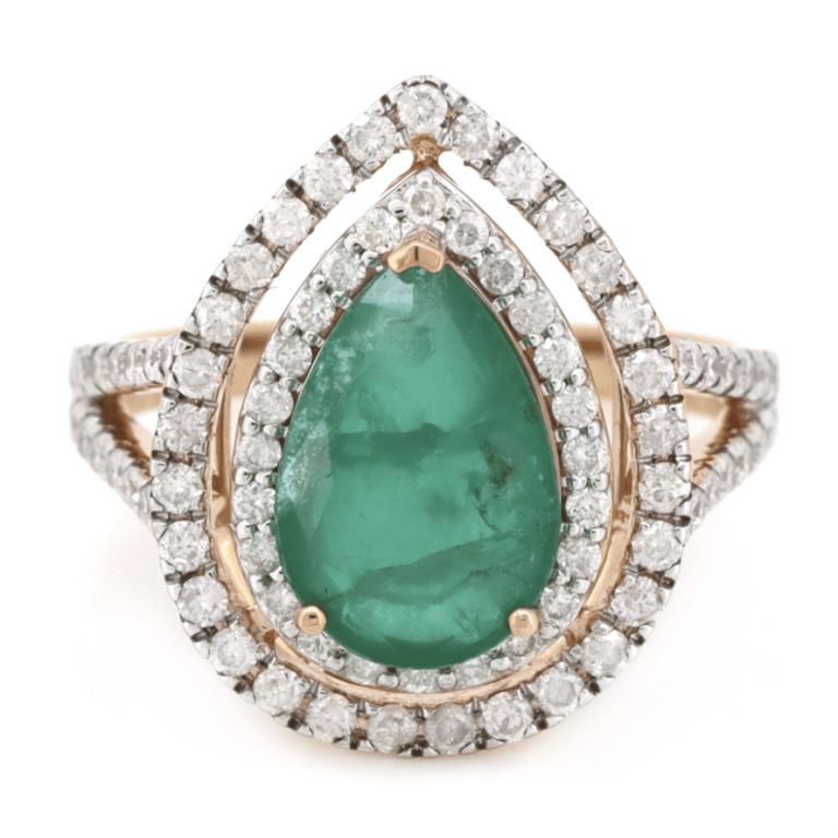 14K ROSE GOLD, 2.43CT ZAMBIAN EMERALD AND DIAMOND, DOUBLE HALO SPLIT BAND RING. The Centre Features, One Pear Cut, Deep Bluish-Green, Zambian Emerald (2.43Ct, Moderately Included), Claw Set. Surrounding The Centre In A Double Halo And Decorating The Split Band Are, 81 Round Brilliant Cut, Diamonds (0.76Ct Tdw, G-H Colour, Si1-Si2 Clarity), Micro-Bead/Pip-Claw Set. Ring Size N. Valuations Provided by an Independent Third-Party Professional Not Directly Associated With Lloyds Auctions at AUD $$21,000.00This valuation has been conducted by an independent third-party professional. The valuation amount is an assessment by the issuing valuer and does not reflect the auction value of the item. Any inquiries regarding the valuation should be directed to the issuing valuer (refer to contact details on the certificate), as Lloyds Auctions has no affiliation or influence over the valuation, the valuer, or the stated amount. Condition: Good - Refer Images 0645832+5299