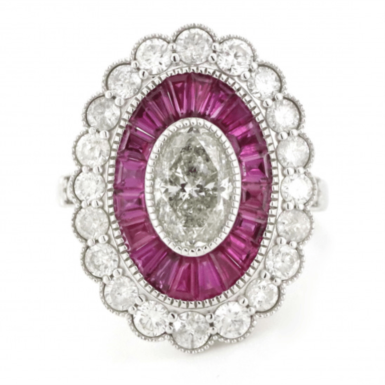 14K WHITE GOLD, DIAMOND AND RUBY, STATEMENT CLUSTER RING. The Centre Features, One Oval Modified Cut, Diamond (1.52Ct, K-L Colour, P2-P3 Clarity), Bezel Set. Surrounding The Centre In A Halo Are, 20 Baguette Cut, Bright Vivid Red, Rubies (1.20Ct Tsw, Moderately Included), Channel Set. Encompassing The Design Are, 20 Round Brilliant Cut, Diamonds (1.49Ct Tdw, G-H Colour, P2+ Clarity), Bezel Set. Ring Size O. Valuations Provided by an Independent Third-Party Professional Not Directly Associated With Lloyds Auctions at AUD $$74,000.00This valuation has been conducted by an independent third-party professional. The valuation amount is an assessment by the issuing valuer and does not reflect the auction value of the item. Any inquiries regarding the valuation should be directed to the issuing valuer (refer to contact details on the certificate), as Lloyds Auctions has no affiliation or influence over the valuation, the valuer, or the stated amount. Condition: Good - Refer Images 0645832+5213