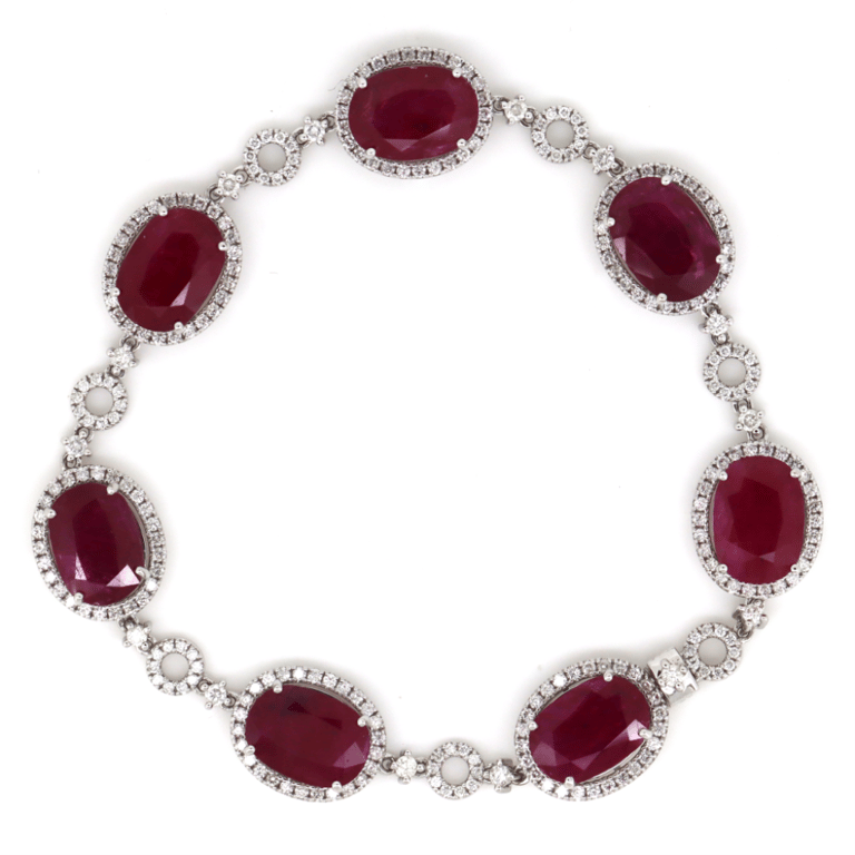 The Bracelet Features, 7 Oval Mixed Cut, Deep Moderate Red, Rubies (35.24Ct Tsw, Very Heavily Included), 4 Claw Set. Encompassing The Centre In A Halo Are, 266 Round Brilliant Cut, Diamonds (2.65Ct Tdw, H-I Colour, Si1-Si2 Clarity), Bead Set. The Bracelet Length Is 18.50Cm And Features A Concealed Box Snap Clasp.