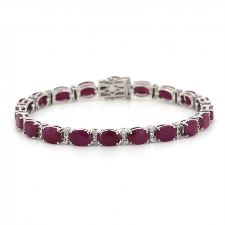14K WHITE GOLD, RUBY AND DIAMOND, LINE BRACELET. The Bracelet Features, 20 Oval Faceted Cut, Medium Deep Pinkish-Red, Rubies (16.90Ct Tsw, Slightly Included), 4 Claw Set. Alternating Between Are, 60 Round Brilliant Cut, Diamonds (0.66Ct Tdw, I-K Colour, P1-P3 Clarity), Claw Set. The Bracelet Length Is 17Cm. Valuations Provided by an Independent Third-Party Professional Not Directly Associated With Lloyds Auctions at AUD $$23,870.00This valuation has been conducted by an independent third-party professional. The valuation amount is an assessment by the issuing valuer and does not reflect the auction value of the item. Any inquiries regarding the valuation should be directed to the issuing valuer (refer to contact details on the certificate), as Lloyds Auctions has no affiliation or influence over the valuation, the valuer, or the stated amount. Condition: Good - Refer Images 0645832+5263
