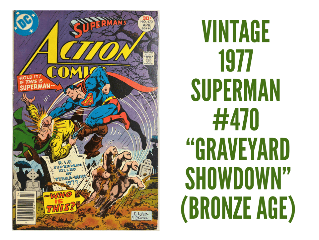 1977 ACTION COMICS #470 – BRONZE AGE GRAVEYARD IDENTITY MYSTERYThis 1977 Action Comics #470 Features A Shocking Graveyard Showdown As Superman’S Identity Is Called Into Question. A Gripping Bronze Age Issue With A Dramatic Twist.- 1977 Action Comics Issue #470- Bronze Age Superman Comic- Graveyard Mystery StorylineSize: Condition: Good - Refer To Images+116