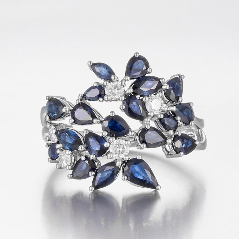 Featuring Centre, 15 Pear And 4 Marquise Cut, Deep Moderate Royal Blue Australian Sapphires (2.31Ct Tsw, Moderately Included), Claw Set, With 5 Round Brilliant Cut Diamonds (0.24Ct Tdw, G-H Colour, Vs2 Clarity), Bead Set. Ring Size O.