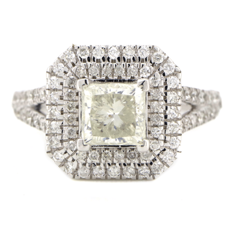 14K WHITE GOLD, LIGHT FANCY YELLOW DIAMOND AND DIAMOND, DOUBLE HALO SPLIT BAND RING. The Centre Features, One Princess Cut, Light Fancy Yellow Diamond (1.54Ct, Si1-Si2 Clarity), 4 Claw Set. Surrounding The Centre In A Double Halo And Decorating The Split Band Are, 112 Round Brilliant Cut, Diamonds (0.67Ct Tdw, G-I Colour, Si-I2 Clarity), Claw Set. Ring Size M. Valuations Provided by an Independent Third-Party Professional Not Directly Associated With Lloyds Auctions at AUD $$50,200.00This valuation has been conducted by an independent third-party professional. The valuation amount is an assessment by the issuing valuer and does not reflect the auction value of the item. Any inquiries regarding the valuation should be directed to the issuing valuer (refer to contact details on the certificate), as Lloyds Auctions has no affiliation or influence over the valuation, the valuer, or the stated amount. Condition: Good - Refer Images 0645832+5210
