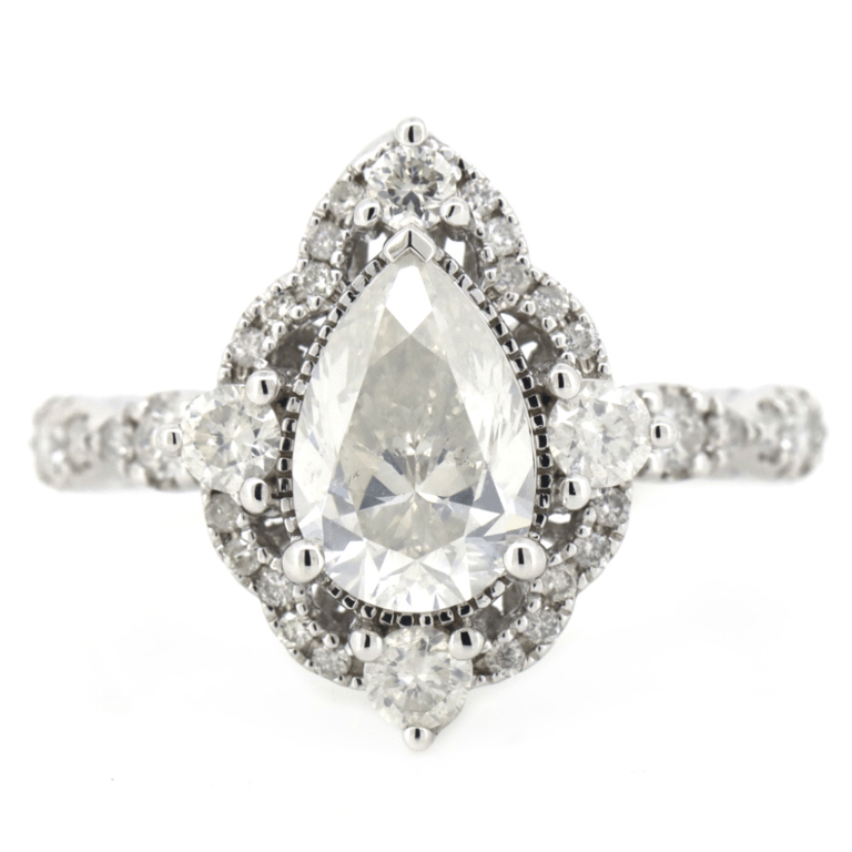 The Centre Features, One Pear Cut, Diamond (1.50Ct, G Colour, P2 Clarity), 3 Claw Set. Surrounding The Centre And Decorating The Band Are, 36 Round Brilliant Cut, Diamonds (0.59Ct Tdw, G-H Colour, Si1-Si2 Clarity), Claw Set. Ring Size M.