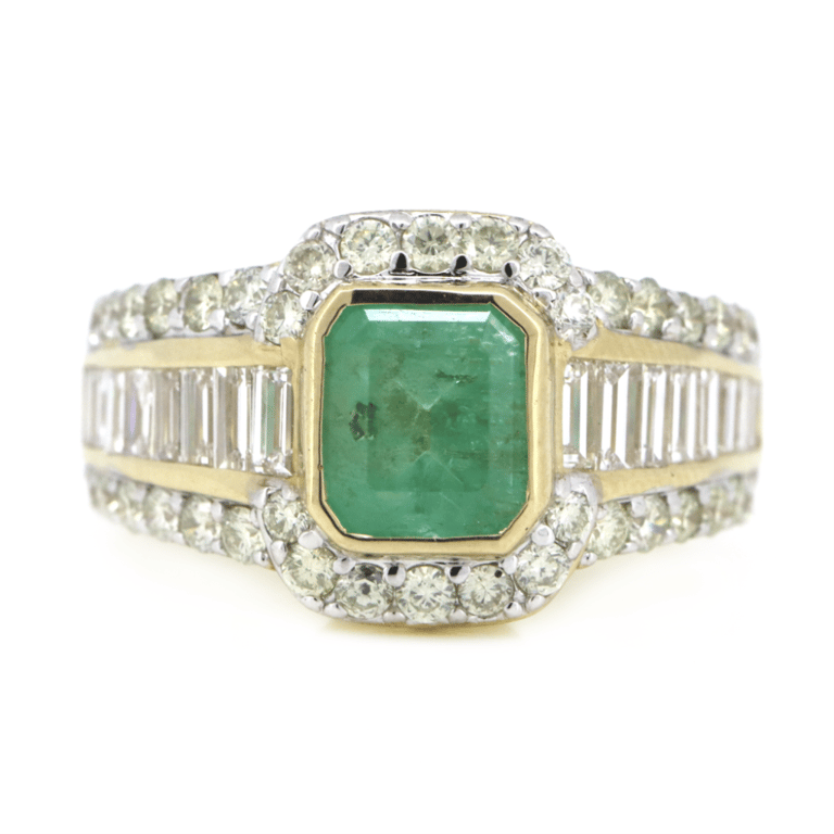 The Centre Features, One Rectangle Step Cut, Colombian Emerald (2.96Ct, Slight-Moderate Inclusions), Bezel Set. Flanking The Centre In Rows Are, 16 Tapered Baguette Cut, Diamonds (1.01Ct Tdw, G-H Colour, Si1-Si2 Clarity), Channel Set. Bordering The Design Are, 38 Round Brilliant Cut, Diamonds (0.99Ct Tdw, G-H Colour, Si1-Si2 Clarity), Bead Set. Ring Size Q.