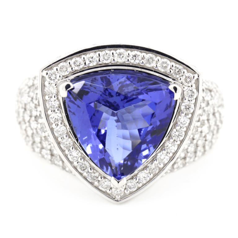 The Centre Features, One Trilliant Cut, Vivid Deep Purple, Tanzanite (5.10Ct, Slightly Included), 3 Claw Set. Encompassing The Centre Are, 171 Round Brilliant Cut, Diamonds (1.88Ct Tdw, G-H Colour, Si1-Si2 Clarity), Bead Set. Ring Size N 1/2.