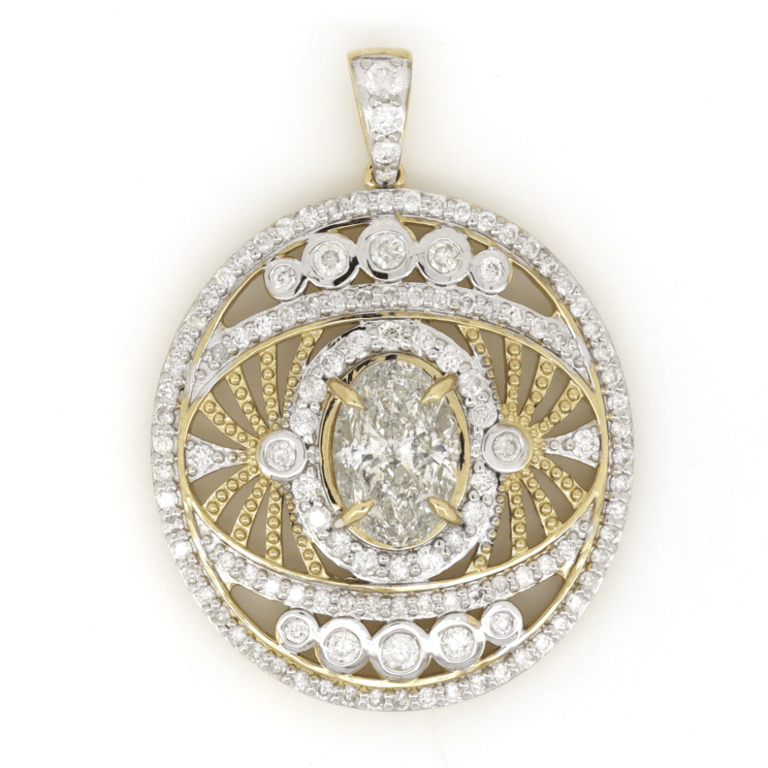 14K YELLOW GOLD AND DIAMOND, STATEMENT PENDANT. The Centre Features, One Oval Moderate Brilliant Cut, Diamond (1.27Ct Tdw, K-L Colour, P2-P3 Clarity) 4 Claw Set. Encompassing The Centre Are, 124 Round Brilliant Cut, Diamonds (0.80Ct Tdw, H-J Colour, P2-P3 Clarity) Micro-Bead/Bezel Set. Valuations Provided by an Independent Third-Party Professional Not Directly Associated With Lloyds Auctions at AUD $$35,000.00This valuation has been conducted by an independent third-party professional. The valuation amount is an assessment by the issuing valuer and does not reflect the auction value of the item. Any inquiries regarding the valuation should be directed to the issuing valuer (refer to contact details on the certificate), as Lloyds Auctions has no affiliation or influence over the valuation, the valuer, or the stated amount. Condition: Good - Refer Images 0645832+5228