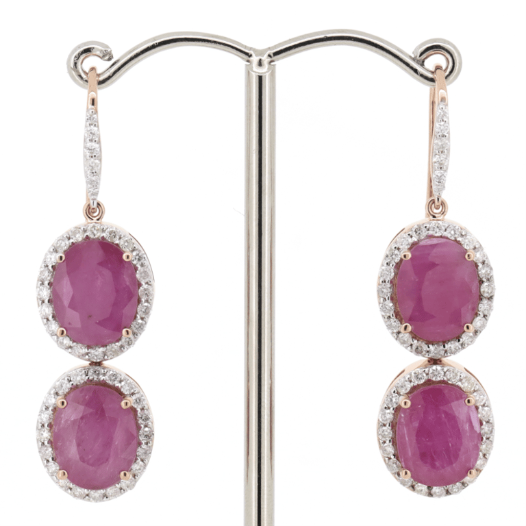 14K ROSE/WHITE GOLD, RUBY AND DIAMOND, HALO DROP EARRINGS. The Designs Feature, 4 Oval Cut, Deep Pinkish-Red, Rubies (10.61Ct Tsw, Heavily Included), 4 Claw Basket Set. Surrounding Each Ruby In Halos Are, 96 Round Brilliant Cut, Diamonds (1.11Ct Tdw, G-H Colour, Si1-Si2 Clarity), Bead Set. The Earrings Feature Shephard Hooks. Valuations Provided by an Independent Third-Party Professional Not Directly Associated With Lloyds Auctions at AUD $$30,000.00This valuation has been conducted by an independent third-party professional. The valuation amount is an assessment by the issuing valuer and does not reflect the auction value of the item. Any inquiries regarding the valuation should be directed to the issuing valuer (refer to contact details on the certificate), as Lloyds Auctions has no affiliation or influence over the valuation, the valuer, or the stated amount. Condition: Good - Refer Images 0645832+5239