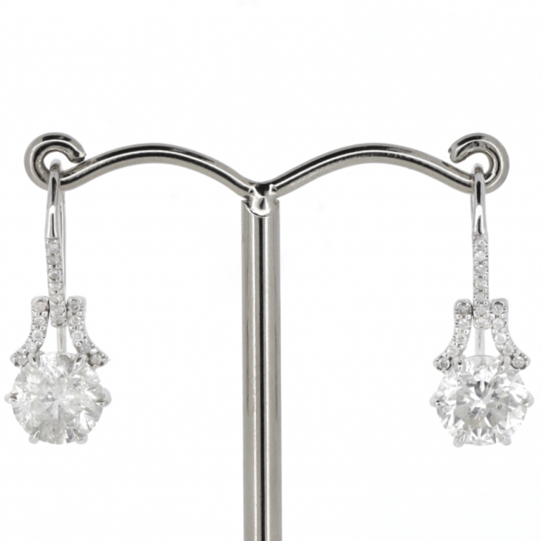 14K WHITE GOLD AND DIAMOND, DROP EARRINGS. The Drops Feature, 2 Round Brilliant Cut, Diamonds (2.84Ct Tdw, J-K Colour, P1-P2 Clarity), 6 Claw Set. Decorating The Setting And Hooks Are, 34 Round Brilliant Cut, Diamonds (0.25Ct Tdw, J-K Colour, P1-P2 Clarity), Claw Set. The Earrings Have Shepherd Hooks. Valuations Provided by an Independent Third-Party Professional Not Directly Associated With Lloyds Auctions at AUD $$57,000.00This valuation has been conducted by an independent third-party professional. The valuation amount is an assessment by the issuing valuer and does not reflect the auction value of the item. Any inquiries regarding the valuation should be directed to the issuing valuer (refer to contact details on the certificate), as Lloyds Auctions has no affiliation or influence over the valuation, the valuer, or the stated amount. Condition: Good - Refer Images 0645832+5202