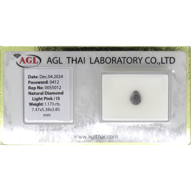 1.173CT CERTIFIED, NATURAL PINK DIAMOND. Pear Brilliant Cut, Faint Pink Colour, I3 Clarity, Loose, Unset. Stone Comes Sealed With Agl Report: 0055012. Valuations Provided by an Independent Third-Party Professional Not Directly Associated With Lloyds Auctions at AUD $$20,000.00This valuation has been conducted by an independent third-party professional. The valuation amount is an assessment by the issuing valuer and does not reflect the auction value of the item. Any inquiries regarding the valuation should be directed to the issuing valuer (refer to contact details on the certificate), as Lloyds Auctions has no affiliation or influence over the valuation, the valuer, or the stated amount. Condition: Good - Refer Images 06+45827+2363