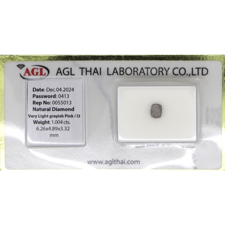 1.004CT CERTIFIED, NATURAL PINK DIAMOND. Cushion Brilliant Cut, Very Light Greyish-Pink Colour, I3 Clarity, Loose, Unset. Stone Comes Sealed With Agl Report: 0058013. Valuations Provided by an Independent Third-Party Professional Not Directly Associated With Lloyds Auctions at AUD $$20,000.00This valuation has been conducted by an independent third-party professional. The valuation amount is an assessment by the issuing valuer and does not reflect the auction value of the item. Any inquiries regarding the valuation should be directed to the issuing valuer (refer to contact details on the certificate), as Lloyds Auctions has no affiliation or influence over the valuation, the valuer, or the stated amount. Condition: Good - Refer Images 06+45827+2389