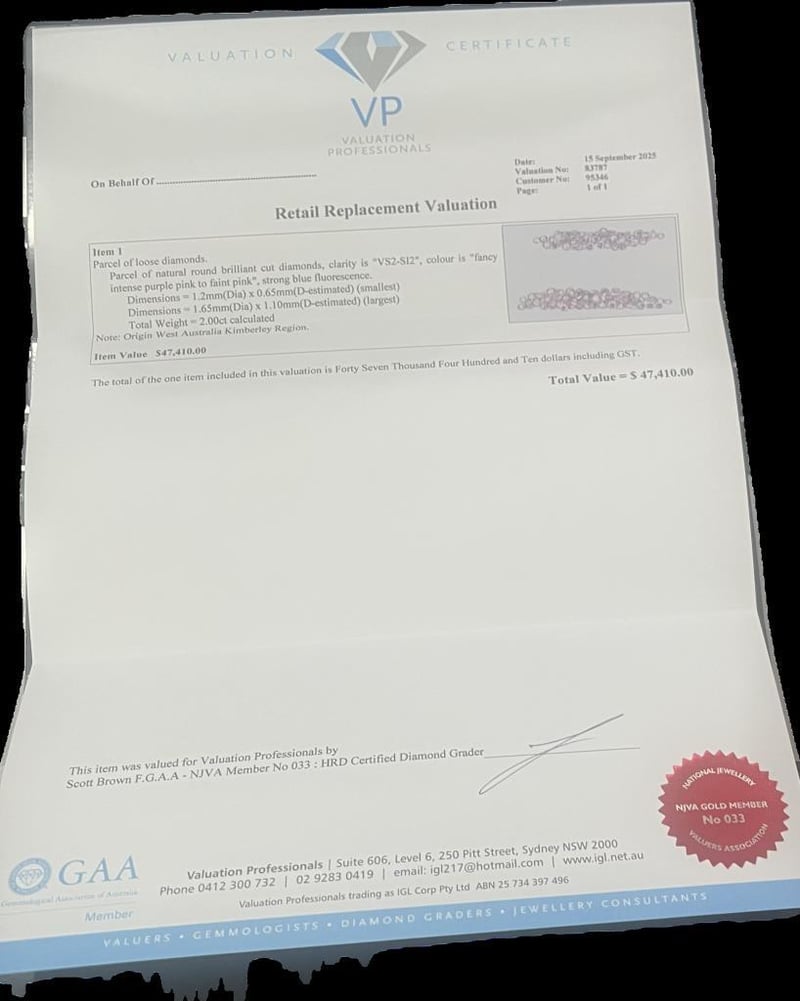 2.00 Tcw Parcel Of Natural Round Brilliant Cut Fancy Intense Purple Pink To Fain Pink Origin West Australia Kimberley Region With Retail Replacment Valuation Report Vp-$47,410--Western Australia Argyle-Rare....With Valuation $47410-Rare Color....With Technical Report...2 Carat Is Very Scarce Nestled Deep Within The Rugged Terrain Of Western Australia Lies One Of The World`S Most Extraordinary Treasures