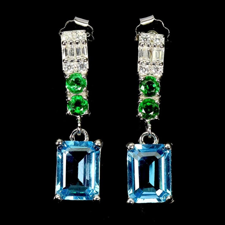 NATURAL SWISS BLUE & GREEN TOPAZ EARRINGS. Natural Swiss Blue & Green Topaz Earrings. Made In Solid Sterling Silver And Plated In14K White Gold. Features Natural Swiss Blue Topaz, Natural Green Topaz And Sparkling Czs. Earrings Measure 23.0 X 6.0 Mm. Condition: Good - Refer Images 0488219+10
