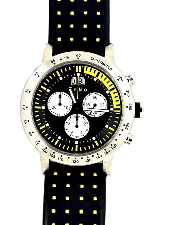 TENO WATCH DYRON SPORT CHRONOGRAPH Brand: Teno Model Number: 089.8302.14 Dial: Dial black- yellow- white with rotating bezel, Case: Stainless steel Bracelet: Black- yellow leather strap with deployment buckle. Swiss Made, Quarz Movement, Sapphire Crystal, 10Atm, Ø 44Mm. Condition: Good - Refer to Images FC