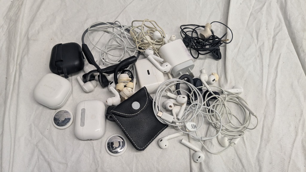 Assorted Wireless and Wired Earbuds, Airpods, Power Adapter Apple Airtags and More, Quantity to Photos SOLD AS LOT