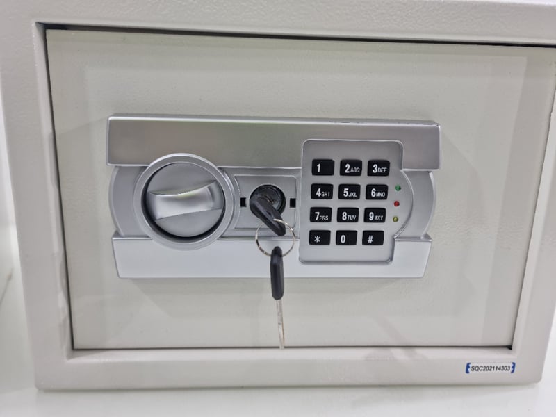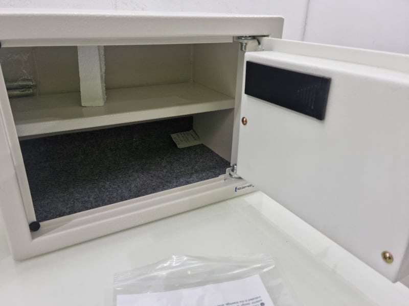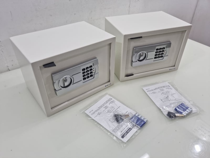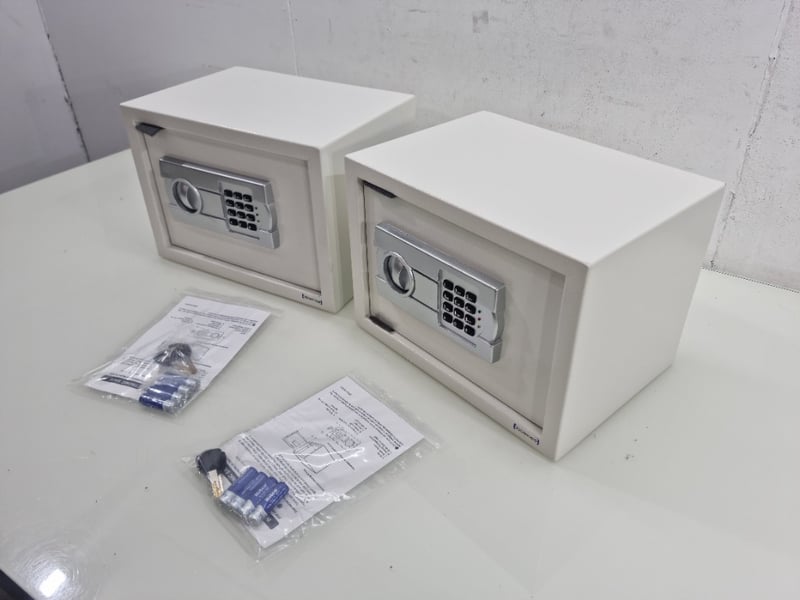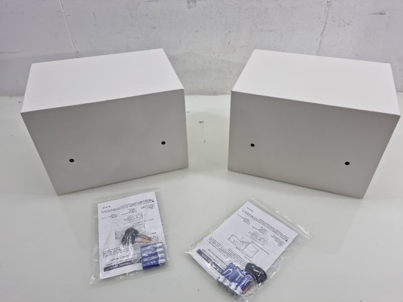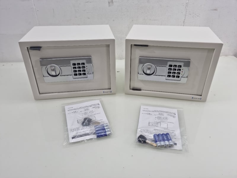 2x New In Box, White Steel Digital Combination Safes With Emergency Key, Features Shelf And Bolt Holes For Secure Mounting.
