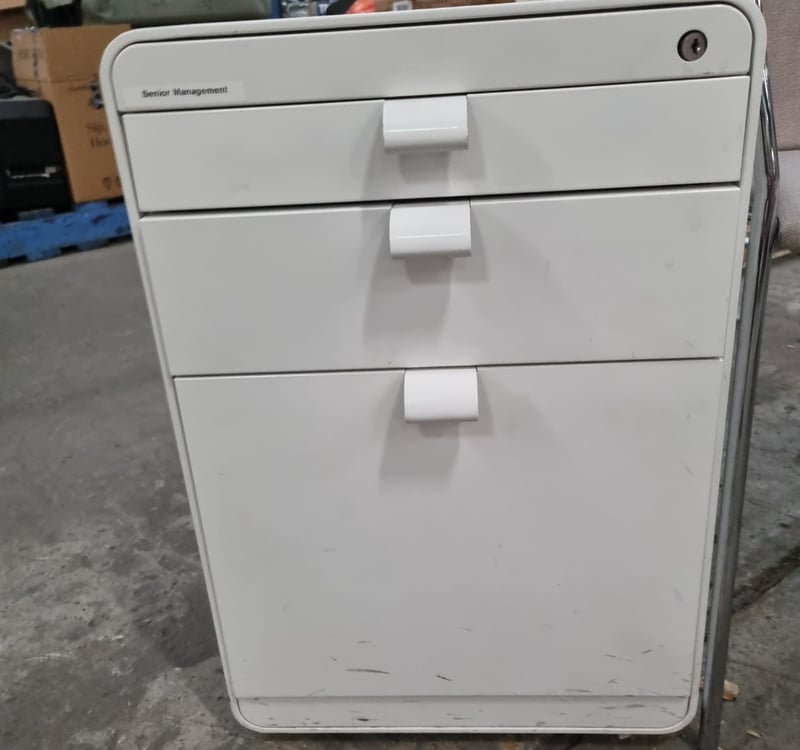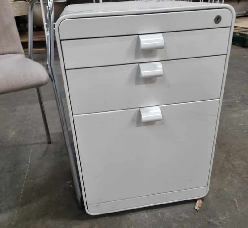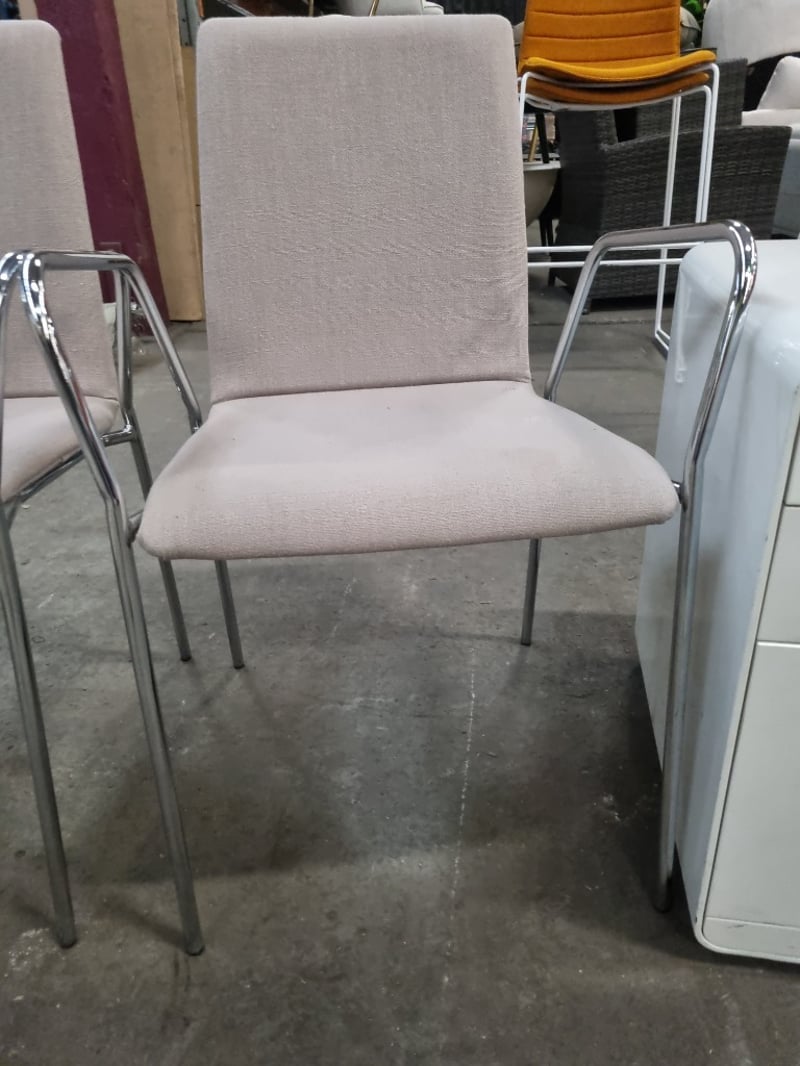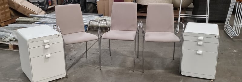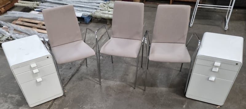 Office furniture, 3 x light brown upholstered, steel frame office chairs, 2 x white metal 3 drawer office cabinets.