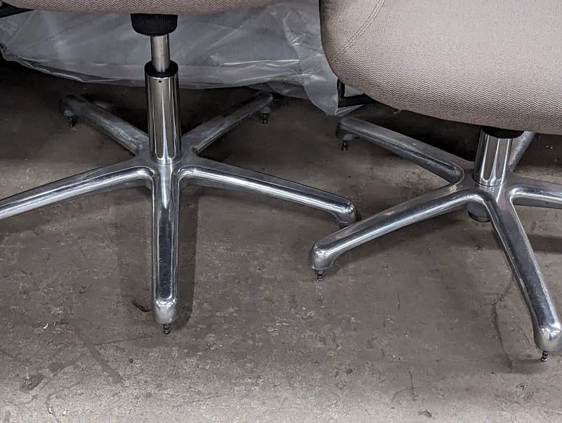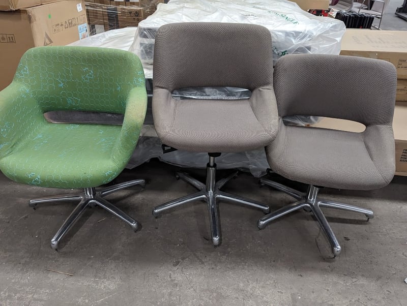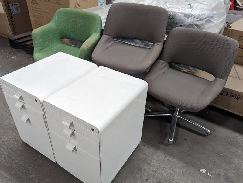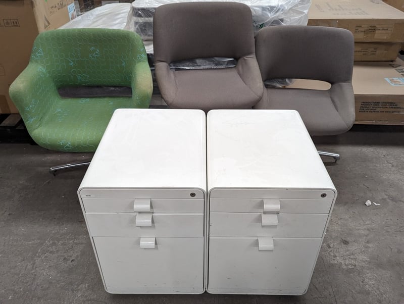 Office Furniture Lot – 2 White Filing Cabinets + 3 Office Chairs with no wheels on all 3. Note: signs of wear Sold as lot