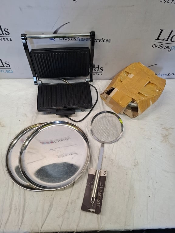 Assorted lot of, sandwich press, frying pan skimmer & more NOTE: CLEANING RECOMMENDED SOLD AS LOT