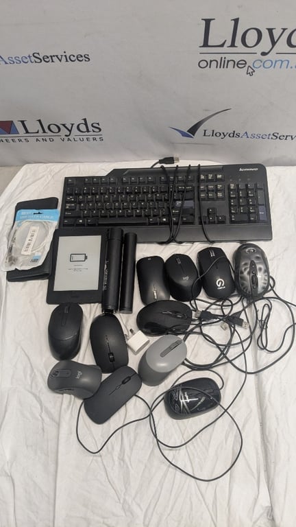 Assorted Computer Accessories, Includes Lenovo Wired Keyboard, Various Mice, Amazon Kindle and more SOLD AS LOT NOTE: INSPECTIONS HIGHLY RECOMMENDED