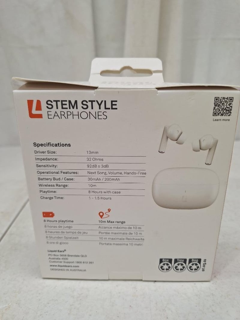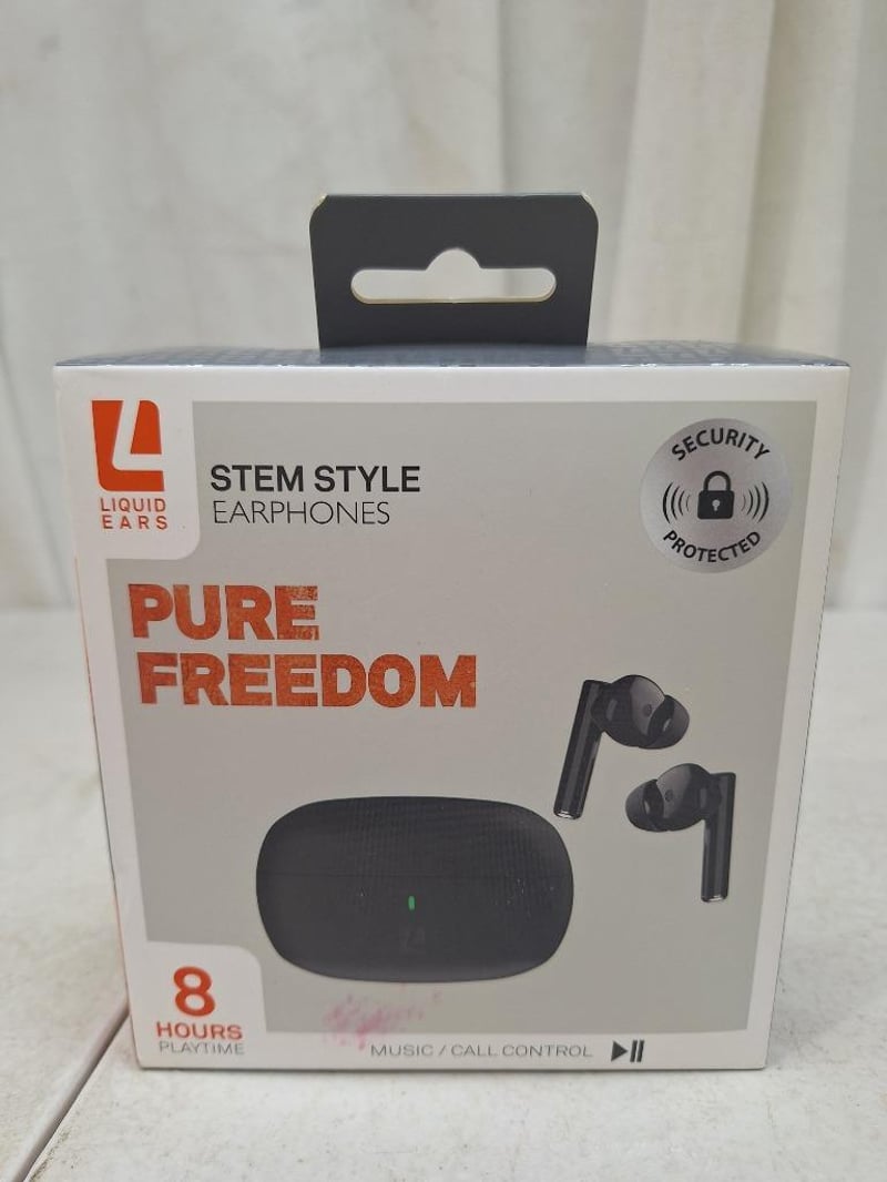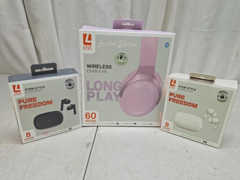 2x LIQUID EARS stem style earphones, 8h playtime, NEW in box, 1x LIQUID EARS Limited edition wireless over-ear long play, 60h playtime, factory sealed in box
