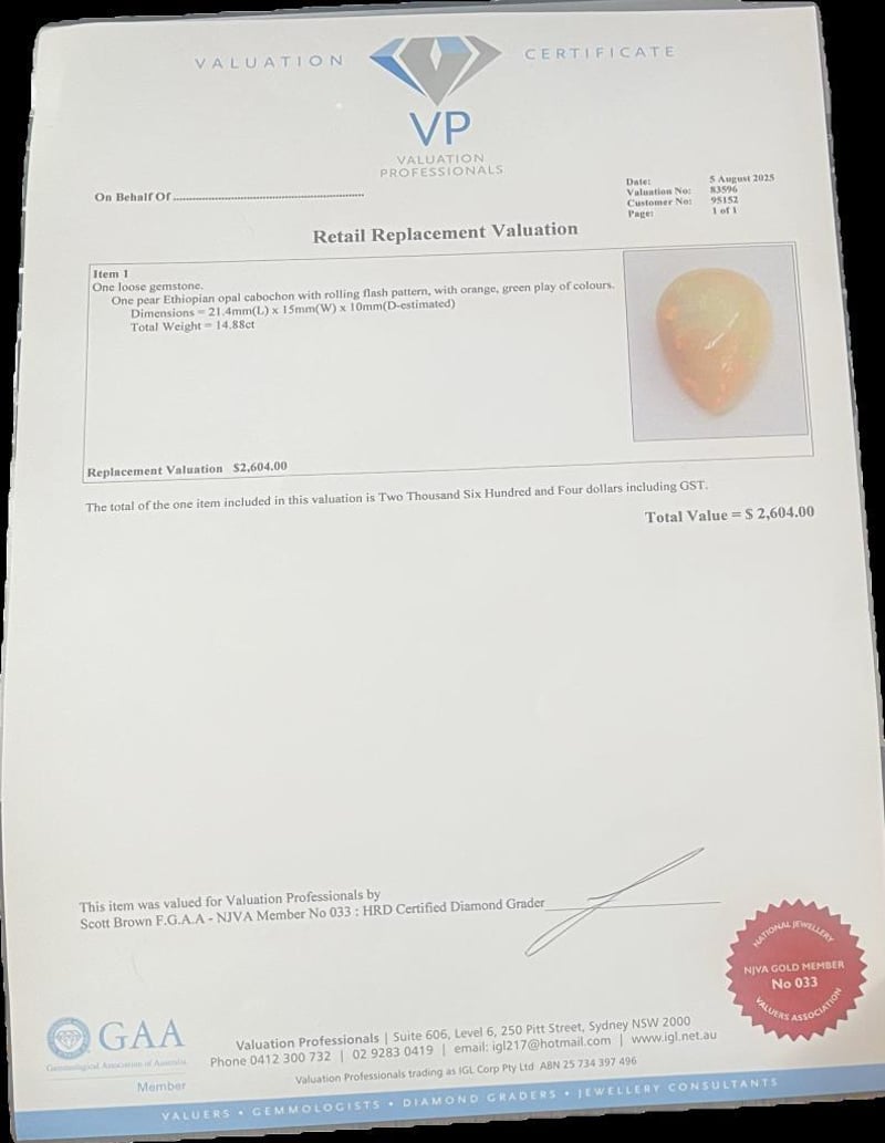 14.88 CARAT ONE PEAR SHAPE ETHIOPIAN OPAL CABOCHAN WITH ROLLINH FLASH PATTERN, WITH ORANGE, GREEN PLAY OF COLOURS.