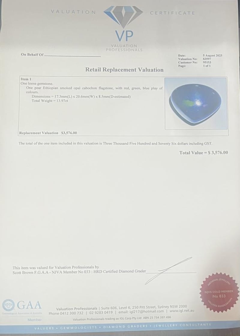 13.97 CARAT PEAR ETHIOPIAN SMOKED OPAL CABOCHON RETAIL VALUATION $3,576
