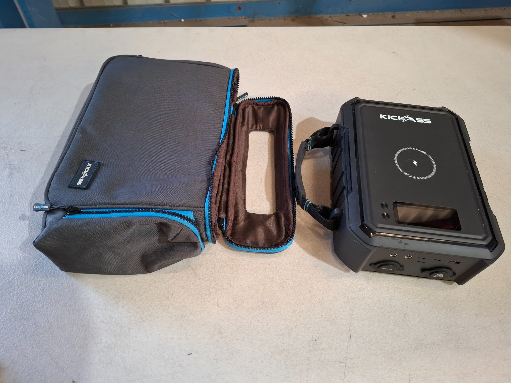 Portable battery charger with carrycase, wireless charging, 12v power sockets