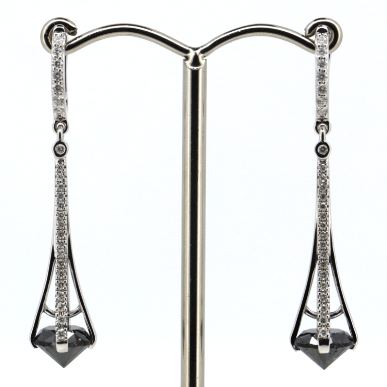 14K WHITE GOLD, DIAMOND AND BLACK DIAMOND AND DIAMOND, DROP EARRINGS. The Earrings Feature, 2 Round Brilliant Cut, Black, Diamonds (3.88Ct Tdw, Opaque), Cutaway Claw. Encompassing The Centre Are, 50 Round Brilliant Cut, Diamonds (0.38Ct Tdw, G-H Colour, Si1-Si2 Clarity), Bezel Set. The Earrings Feature Huggie Backs. Valuations Provided by an Independent Third-Party Professional Not Directly Associated With Lloyds Auctions at AUD $$20,000.00This valuation has been conducted by an independent third-party professional. The valuation amount is an assessment by the issuing valuer and does not reflect the auction value of the item. Any inquiries regarding the valuation should be directed to the issuing valuer (refer to contact details on the certificate), as Lloyds Auctions has no affiliation or influence over the valuation, the valuer, or the stated amount. Condition: Good - Refer Images 0645842+3106