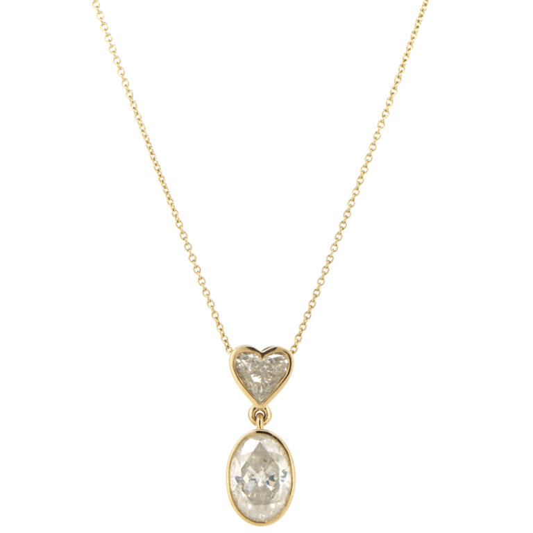 14K YELLOW GOLD AND DIAMOND, PENDANT NECKLACE. The Necklace Features, One Oval Cut, Diamond (2.09Ct, L-M Colour, P2 Clarity), Bezel Set. In Addition The Necklace Features, One Heart Cut, Diamond (0.69Ct, L-M Colour, P2 Clarity), Bezel Set. The Necklace Features A Fine Link Cable Chain And Features A Lobster Clasp. The Necklace Is 45Cm. Valuations Provided by an Independent Third-Party Professional Not Directly Associated With Lloyds Auctions at AUD $$60,000.00This valuation has been conducted by an independent third-party professional. The valuation amount is an assessment by the issuing valuer and does not reflect the auction value of the item. Any inquiries regarding the valuation should be directed to the issuing valuer (refer to contact details on the certificate), as Lloyds Auctions has no affiliation or influence over the valuation, the valuer, or the stated amount. Condition: Good - Refer Images 0645842+3119