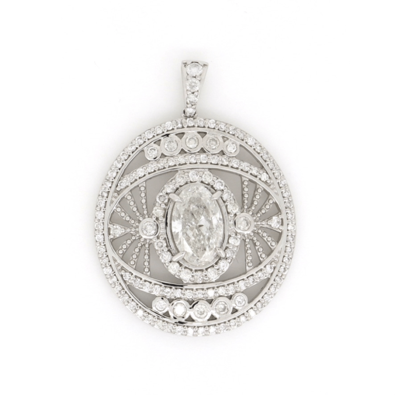 14K WHITE GOLD AND DIAMOND, DECORATIVE PENDANT. The Centre Features, One Oval Brilliant Cut, Diamond (1.27Ct, K-L Colour, P2-P3 Clarity), 4 Claw Set. Encompassing The Design Are, 124 Round Brilliant Cut, Diamonds (0.80Ct Tdw, H-J Colour, P2-P3 Clarity), Micro-Bead/Bezel Set. Total Weight Of Pendant Is 4.21G. Valuations Provided by an Independent Third-Party Professional Not Directly Associated With Lloyds Auctions at AUD $$25,000.00This valuation has been conducted by an independent third-party professional. The valuation amount is an assessment by the issuing valuer and does not reflect the auction value of the item. Any inquiries regarding the valuation should be directed to the issuing valuer (refer to contact details on the certificate), as Lloyds Auctions has no affiliation or influence over the valuation, the valuer, or the stated amount. Condition: Good - Refer Images 0645842+3104