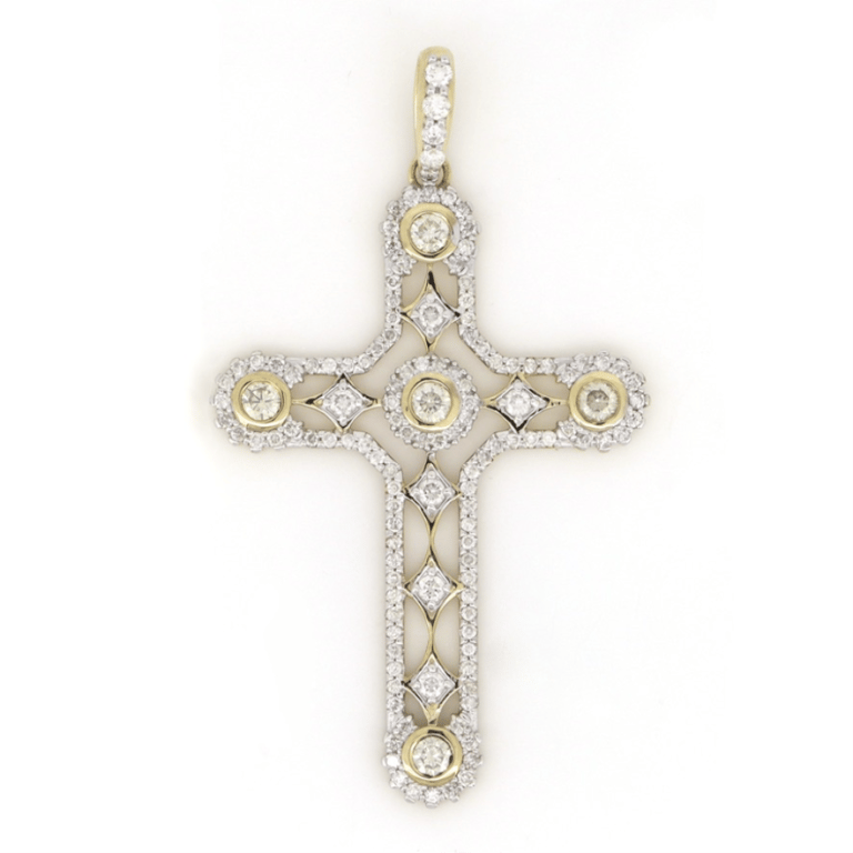 14K YELLOW GOLD AND DIAMOND, DECORATIVE CRUCIFIX PENDANT. The Design Features, 5 Round Brilliant Cut, Diamonds (0.46Ct Tdw, K-M Colour, Si1-2 Clarity), Bezel Set. Bordering The Design Are, 125 Round Brilliant Cut, Diamonds (0.92Ct Tdw, H-J Colour, Si-I2 Clarity), Claw Set. Valuations Provided by an Independent Third-Party Professional Not Directly Associated With Lloyds Auctions at AUD $$18,300.00This valuation has been conducted by an independent third-party professional. The valuation amount is an assessment by the issuing valuer and does not reflect the auction value of the item. Any inquiries regarding the valuation should be directed to the issuing valuer (refer to contact details on the certificate), as Lloyds Auctions has no affiliation or influence over the valuation, the valuer, or the stated amount. Condition: Good - Refer Images 0645842+3140