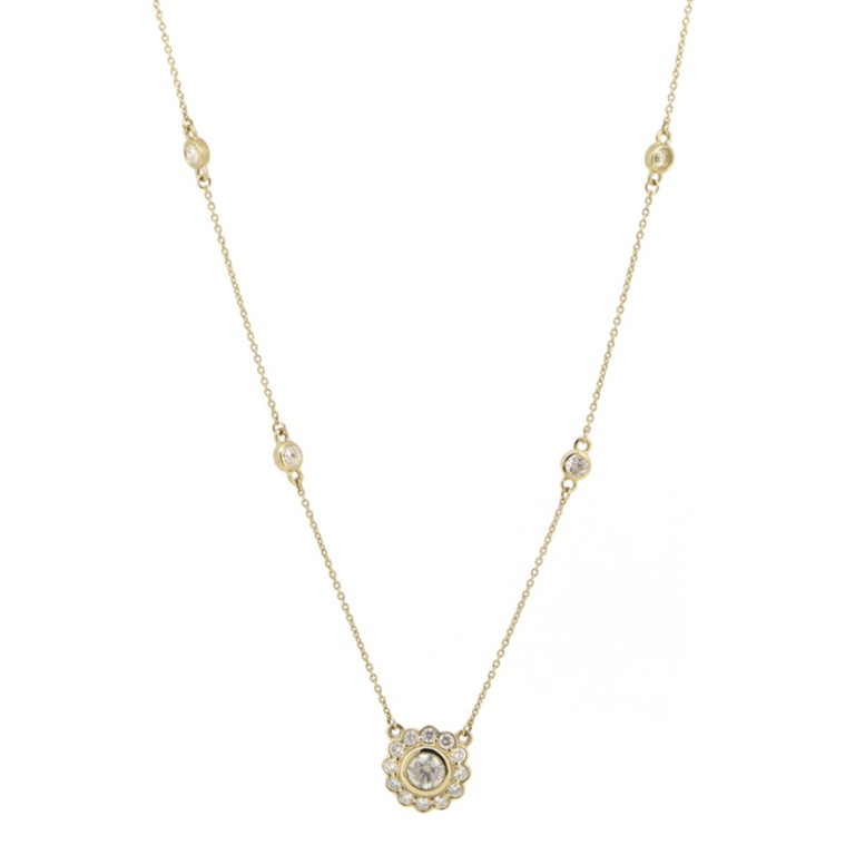 14K YELLOW GOLD AND DIAMOND, HALO NECKLACE. The Pendant Features, One Round Brilliant Cut, Diamond (0.40Ct Tdw, J-K Colour, Si2 Clarity), Bezel Set. Surrounding The Centre In A Halo Are, 12 Round Brilliant Cut, Diamonds (0.48Ct Tdw, J-K Colour, Si1-I1 Clarity), Semi Bezel/Bead Set. Decorating The Chain Are, 6 Round Brilliant Cut, Diamonds (0.31Ct Tdw, J-K Colour, Si1-I1 Clarity), Bezel Set. The Necklace Has A Lobster Claw Clasp. Length Is 55.35Cm. Valuations Provided by an Independent Third-Party Professional Not Directly Associated With Lloyds Auctions at AUD $$11,890.00This valuation has been conducted by an independent third-party professional. The valuation amount is an assessment by the issuing valuer and does not reflect the auction value of the item. Any inquiries regarding the valuation should be directed to the issuing valuer (refer to contact details on the certificate), as Lloyds Auctions has no affiliation or influence over the valuation, the valuer, or the stated amount. Condition: Good - Refer Images 0645842+3103