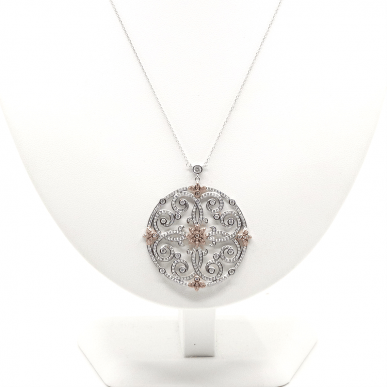 14K WHITE/ROSE GOLD, PINK DIAMOND AND DIAMOND, DECORATIVE NECKLACE. The Pendant Features, 45 Round Brilliant Cut, Blush Pink, Diamonds (0.267Ct Tdw, Si1-Si2 Clarity), Bezel Set. Encompassing Design Are, 277 Round Brilliant Cut, Diamonds (1.54Ct Tdw, G-H Colour, Si1-Si2 Clarity), Bezel Set. Pendant Comes With A Fine Cable Link Chain With A Parrot Clasp, Length Is 44Cm. Valuations Provided by an Independent Third-Party Professional Not Directly Associated With Lloyds Auctions at AUD $$24,000.00This valuation has been conducted by an independent third-party professional. The valuation amount is an assessment by the issuing valuer and does not reflect the auction value of the item. Any inquiries regarding the valuation should be directed to the issuing valuer (refer to contact details on the certificate), as Lloyds Auctions has no affiliation or influence over the valuation, the valuer, or the stated amount. Condition: Good - Refer Images 0645842+3108