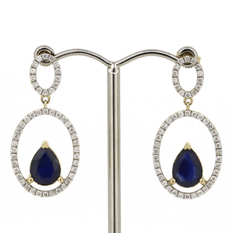 14K YELLOW GOLD, BLUE SAPPHIRE AND DIAMOND, DOUBLE HOOP DROP EARRINGS. The Design Features, 2 Pear Cut, Medium Dark Blue, Sapphires (3.19Ct Tsw, Moderate Eye Visible Inclusions), 3 Claw Set. Decorating The Design In Double Oval Hoops Are, 96 Round Brilliant Cut, Diamonds (0.94Ct Tdw, J-K Colour, Si2-I2 Clarity), Micro-Claw Set In White Gold. The Earrings Have Post Backs, With 14K Yellow Gold Butterfly Clasps. Valuations Provided by an Independent Third-Party Professional Not Directly Associated With Lloyds Auctions at AUD $$11,590.00This valuation has been conducted by an independent third-party professional. The valuation amount is an assessment by the issuing valuer and does not reflect the auction value of the item. Any inquiries regarding the valuation should be directed to the issuing valuer (refer to contact details on the certificate), as Lloyds Auctions has no affiliation or influence over the valuation, the valuer, or the stated amount. Condition: Good - Refer Images 0645841+335