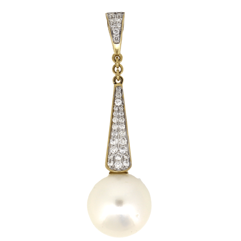 14K YELLOW GOLD, CULTURED SOUTH SEA PEARL AND DIAMOND, PENDANT. The Pendant Features, One Near Round, White Cultured South Sea Pearl (22.88Ct, Aa Lustre, Very Few Blemishes, 15.00Mm), Half Drilled And Cap Set. Decorating The Bail Are, 31 Round Brilliant Cut, Diamonds (0.39Ct Tdw, G-H Colour, Si1-Si2 Clarity), Bead Set. Valuations Provided by an Independent Third-Party Professional Not Directly Associated With Lloyds Auctions at AUD $$14,000.00This valuation has been conducted by an independent third-party professional. The valuation amount is an assessment by the issuing valuer and does not reflect the auction value of the item. Any inquiries regarding the valuation should be directed to the issuing valuer (refer to contact details on the certificate), as Lloyds Auctions has no affiliation or influence over the valuation, the valuer, or the stated amount. Condition: Good - Refer Images 0645841+352
