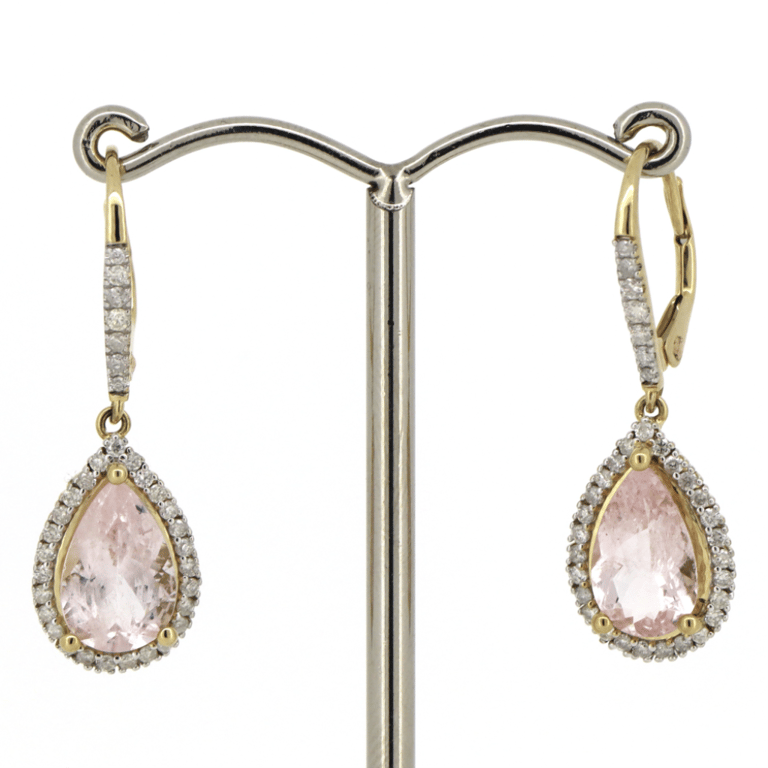 14K YELLOW GOLD, MORGANITE AND DIAMOND, HALO DROP EARRINGS. The Centre Features, 2 Pear Cut, Light Orangish-Pink, Morganites (3.73Ct Tsw, Minor Eye Visible Inclusions), 3 Claw Set. Surrounding The Stones In Halos And Decorating The Hooks Are, 68 Round Brilliant Cut, Diamonds (0.53Ct Tdw, J-K Colour, Si2-I2 Clarity), Claw Set In White Gold. The Earrings Have Lever Back Closures. Valuations Provided by an Independent Third-Party Professional Not Directly Associated With Lloyds Auctions at AUD $$9,590.00This valuation has been conducted by an independent third-party professional. The valuation amount is an assessment by the issuing valuer and does not reflect the auction value of the item. Any inquiries regarding the valuation should be directed to the issuing valuer (refer to contact details on the certificate), as Lloyds Auctions has no affiliation or influence over the valuation, the valuer, or the stated amount. Condition: Good - Refer Images 0645841+364