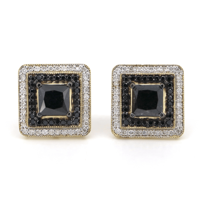 14K YELLOW GOLD, BLACK DIAMOND AND DIAMOND, DOUBLE HALO STUD EARRINGS. The Centres Feature, 2 Princess Cut, Black, Diamonds (2.63Ct Tdw, Opaque), 4 Claw Basket Set. Surrounding The Centre In The Innermost Halo Are, 56 Round Brilliant Cut, Black, Diamonds (0.33Ct Tdw, Opaque), Bead Set. Surrounding The Centre In The Outermost Halo Are, 72 Round Brilliant Cut, Diamonds (0.34Ct Tdw, H-J Colour, Si1-I2+ Clarity), Bead Set. Valuations Provided by an Independent Third-Party Professional Not Directly Associated With Lloyds Auctions at AUD $$15,300.00This valuation has been conducted by an independent third-party professional. The valuation amount is an assessment by the issuing valuer and does not reflect the auction value of the item. Any inquiries regarding the valuation should be directed to the issuing valuer (refer to contact details on the certificate), as Lloyds Auctions has no affiliation or influence over the valuation, the valuer, or the stated amount. Condition: Good - Refer Images 0645841+324