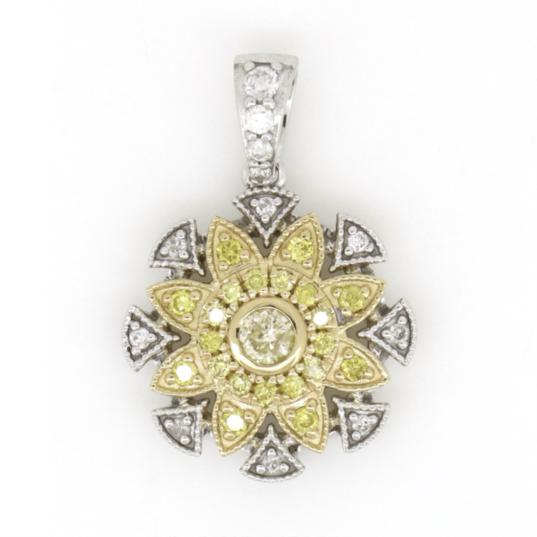 14K WHITE/YELLOW GOLD, FANCY YELLOW DIAMOND AND DIAMOND, DECORATIVE DROP PENDANT. The Centre Features, One Round Brilliant Cut, Fancy Yellow, Diamond (0.08Ct, Si2 Clarity), Bezel Set. Encompassing The Design Are, 21 Round Brilliant Cut, Fancy Yellow, Diamonds (0.20Ct Tdw, Si Clarity), Claw/Bead Set. Decorating The Outer Design Are, 12 Round Brilliant Cut, Diamonds (0.11Ct Tdw, G-J Colour, Si-I2 Clarity), Bead Set. Valuations Provided by an Independent Third-Party Professional Not Directly Associated With Lloyds Auctions at AUD $$7,400.00This valuation has been conducted by an independent third-party professional. The valuation amount is an assessment by the issuing valuer and does not reflect the auction value of the item. Any inquiries regarding the valuation should be directed to the issuing valuer (refer to contact details on the certificate), as Lloyds Auctions has no affiliation or influence over the valuation, the valuer, or the stated amount. Condition: Good - Refer Images 0645841+370