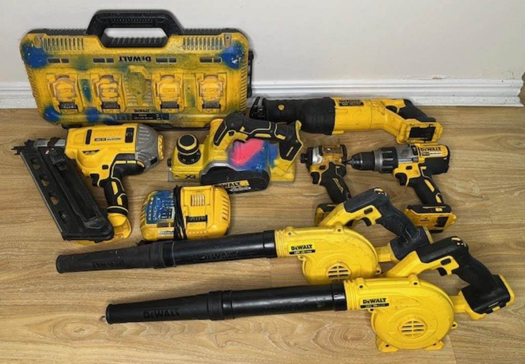 Cordless DeWalt 18V tools. 1 x DCN692 nailer, 2 x DCV100-XE mini blowers, 1 x DCF850 impact driver, 1 x DCS380-XE reciprocating saw, 1 x DCP580-XE planer, 1 x DCD996-XE hammer drill, 1 x DCB118-XE charger, 1 x DCB104 4 port charger. Skins only, no batteries. Condition: Not working, untested, for parts or repair.