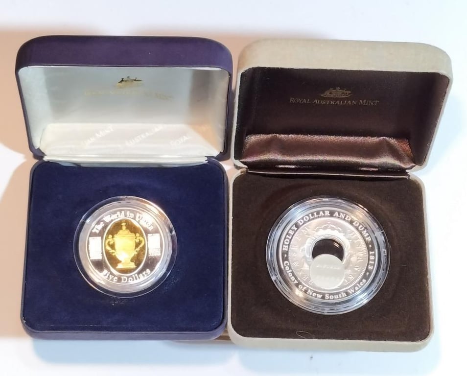 2003 $1 Subscription Coin Holey Dollar & Dump Silver 54.30G; And 2003 $5 Rugby World Cup Selectively Gold Plated Silver Coin 1 Troy Ounce Silver
