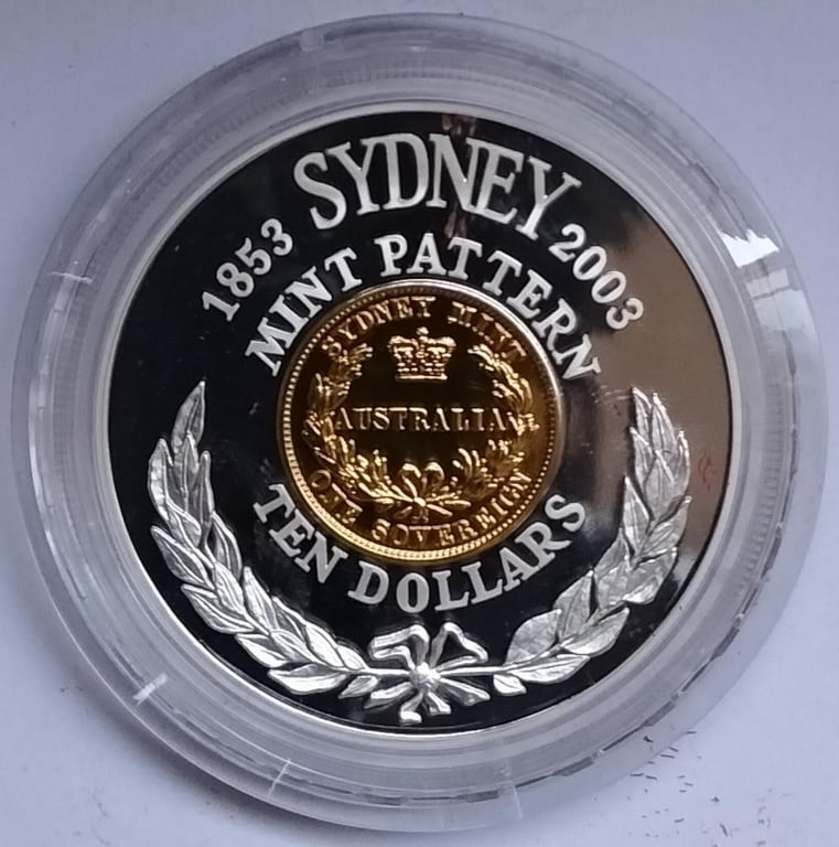 2003 $10 SYDNEY MINT 150TH ANNIVERSARY OF 1853 ONE SOVEREIGN PATTERN GOLD PLATED SILVER COIN 60.5G Nearly Up To 2 Troy Ounce Of Silver Condition: Proof#042223528+20