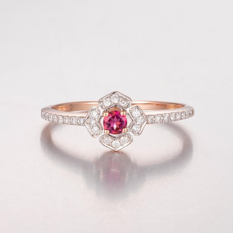 14CT ROSE GOLD PINK SAPPHIRE AND DIAMOND DAINTY RING. Featuring Centre, One Round Cut, Moderate Red Sapphire (0.11Ct, Slightyly Included), Claw Set, With 28 Round Brilliant Cut Diamonds (0.14Ct Tdw, G-H Colour, Vs1-Vs2 Clarity), Pip Claw Set. Ring Size O. Valuations Provided by an Independent Third-Party Professional Not Directly Associated With Lloyds Auctions at AUD $10500This valuation has been conducted by an independent third-party professional. The valuation amount is an assessment by the issuing valuer and does not reflect the auction value of the item. Any inquiries regarding the valuation should be directed to the issuing valuer (refer to contact details on the certificate), as Lloyds Auctions has no affiliation or influence over the valuation, the valuer, or the stated amount. Condition: Good - Refer Images 0587679+1257