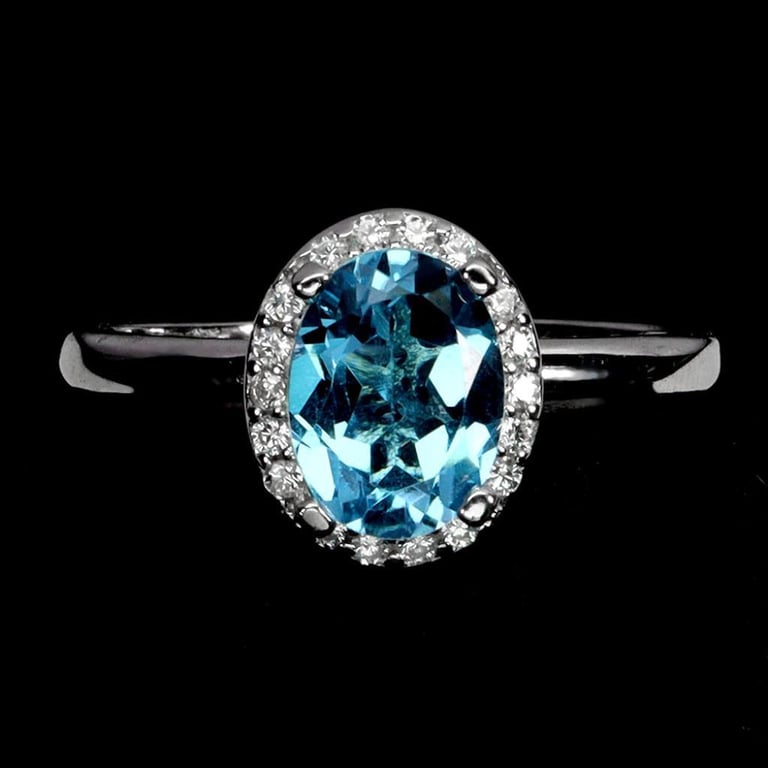 Natural Swiss Blue Topaz Ring. Made In Solid Sterling Silver And Plated In14K White Gold. Features Natural Oval Facet Swiss Blue Topaz And Sparkling Czs. Chain Measures 18 Inches.