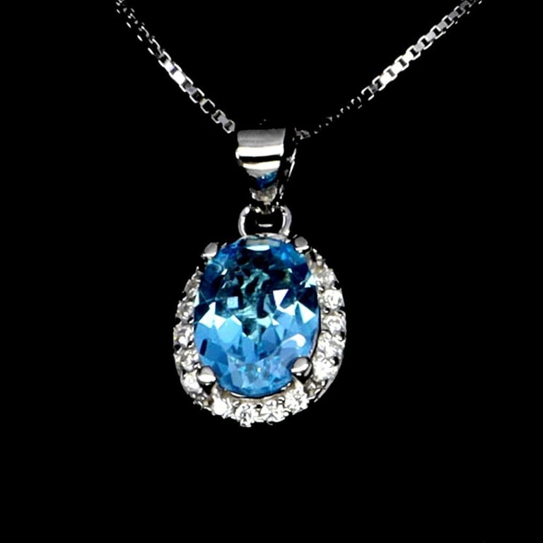 NATURAL SWISS BLUE TOPAZ PENDANT & CHAIN. Natural Swiss Blue Topaz Pendant & Chain. Made In Solid Sterling Silver And Plated In14K White Gold. Features Natural Oval Facet Swiss Blue Topaz And Sparkling Czs. Chain Measures 18 Inches. Condition: Good - Refer Images 0488258+9