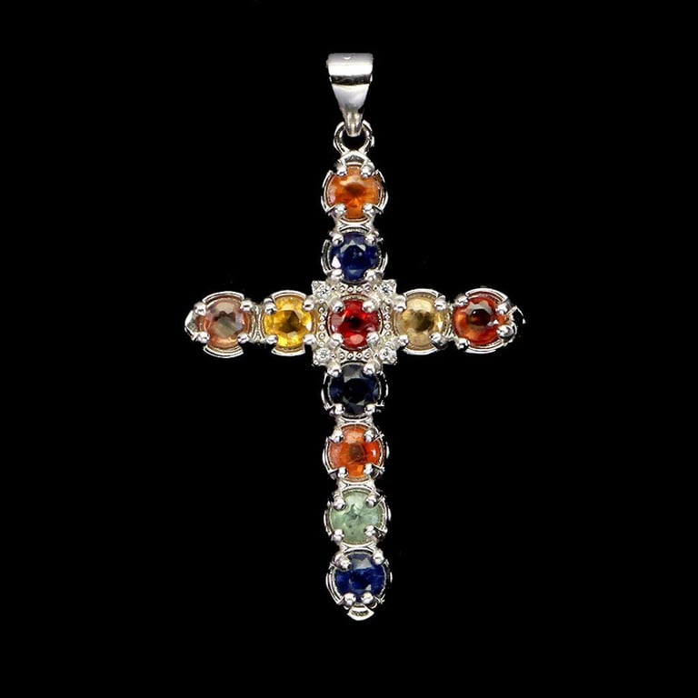 NATURAL FANCY SAPPHIRE CROSS PENDANT. Natural Fancy Sapphire Cross Pendant. Made In Solid Sterling Silver And Plated In14K White Gold. Features Natural Fancy Sapphires And Sparkling Czs. Cross Measures 38X23Mm Condition: Good - Refer Images 0488258+17