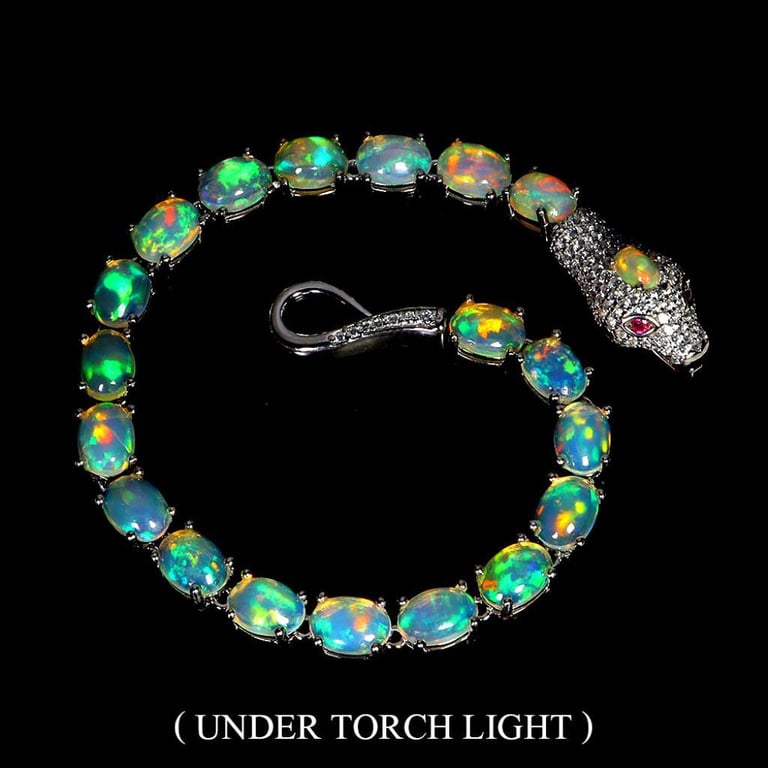 NATURAL FULL FLASH RAINBOW FIRE OPAL SERPENT BRACELET Natural Full Flash Rainbow Fire Opal Serpent Bracelet. Made In Solid Sterling Silver And Plated In14K White Gold. Features Natural Rainbow Fire Opals And Sparkling Czs. Bracelet Measures 6.5 Inches. Condition: Good - Refer Images 0488258+31