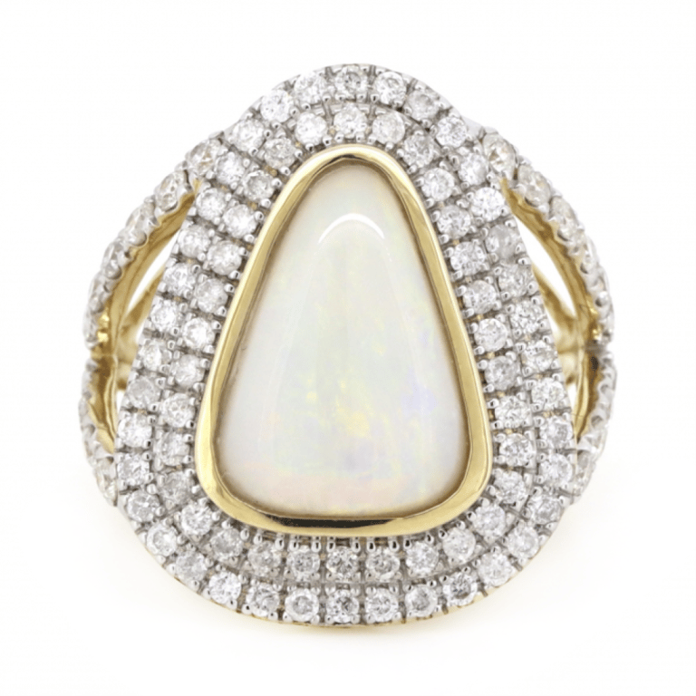 14K YELLOW GOLD, NATURAL WHITE OPAL AND DIAMOND, DOUBLE HALO RING. The Centre Features, One Free Form Cut, Solid White, Natural Opal (3.21Ct, Orange-Green-Yellow-Blue Colour Play), Bezel Set. Surrounding The Centre In A Double Halo And Decorating The Band Are, 90 Round Brilliant Cut, Diamonds (1.18Ct Tdw, I-K Colour, Si2-P2 Clarity), Claw Set. Ring Size N. Valuations Provided by an Independent Third-Party Professional Not Directly Associated With Lloyds Auctions at AUD $$22,750.00This valuation has been conducted by an independent third-party professional. The valuation amount is an assessment by the issuing valuer and does not reflect the auction value of the item. Any inquiries regarding the valuation should be directed to the issuing valuer (refer to contact details on the certificate), as Lloyds Auctions has no affiliation or influence over the valuation, the valuer, or the stated amount. Condition: Good - Refer Images 0645839+1491